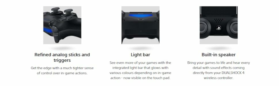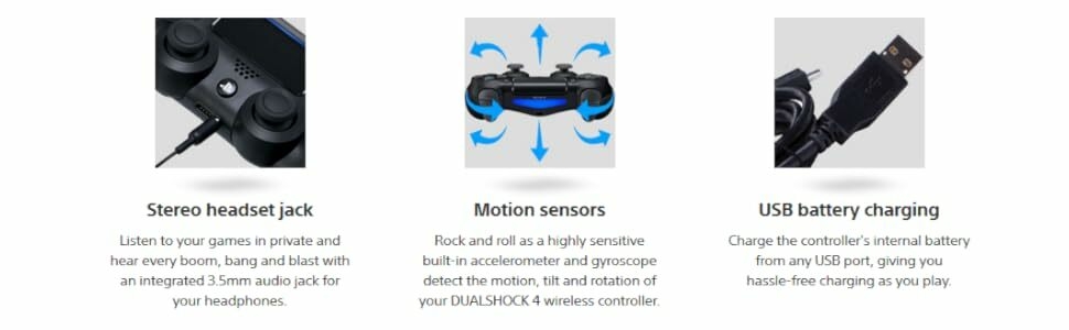 The feel, shape, and sensitivity of the dual analog sticks and trigger buttons have been improved to provide a greater sense of control, no matter what you playThe new multi-touch and clickable touch pad on the face of the DualShock 4 Wireless Controller opens up worlds of new gameplay possibilities for both newcomers and veteran gamersThe DualShock 4 Wireless Controller features a built-in speaker and stereo headset jack, putting several new audio options in the player's handsThe DUALSHOCK 4 wireless controller can be easily recharged by plugging it into your PlayStation 4 system, even when in rest mode, or with any standard charger using a USB cable (type-A to Micro-B Sold Separately)Precision Control: The feel, shape, and sensitivity of the DualShock 4's analog sticks and trigger buttons have been enhanced to offer players absolute control for all games on PlayStation Sharing at Your Fingertips: The addition of the Share button makes sharing your greatest gaming moments as easy as a push of a button. Upload gameplay videos and screenshots directly from your system or live-stream your gameplay, all without disturbing the game in progressNew Ways to Play: Revolutionary features like the touch pad, integrated light bar, and built-in speaker offer exciting new ways to experience and interact with your games, and the 3.5mm audio jack offers a practical personal audio solution for gamers who want to listen to their games in privateA revolution in your hands